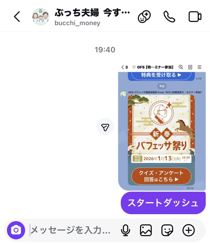 『バフェッサ特典GETがわかるLINEスクショ』と 『スタートダッシュ』の文字をぶっち夫婦にDMした人には3大特典をプレゼント👇