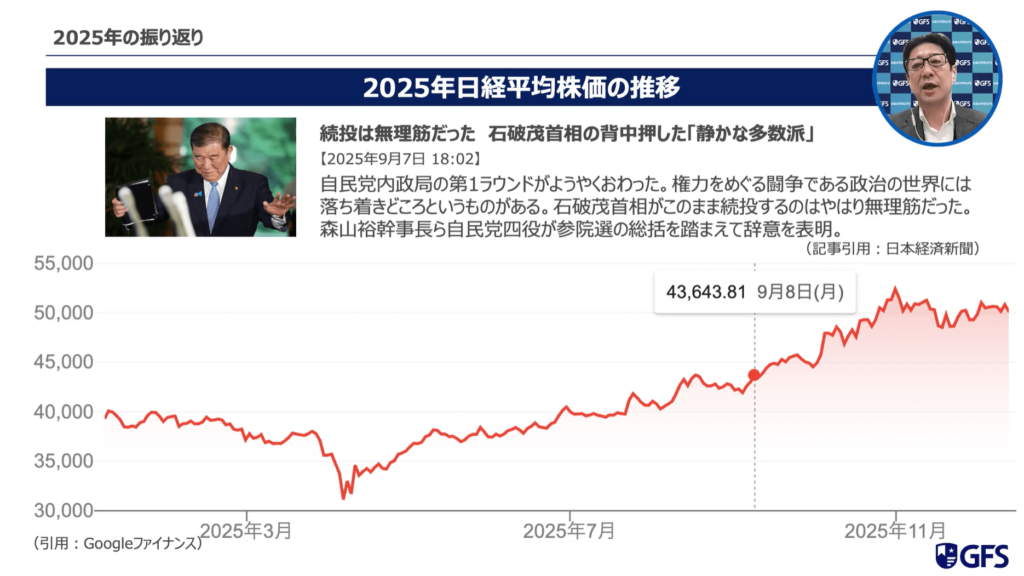 この動画の前半では、GFS校長の市川さんが、2025年に起きた投資イベントとそのイベントによる日経平均株価の推移を振り返っています✨