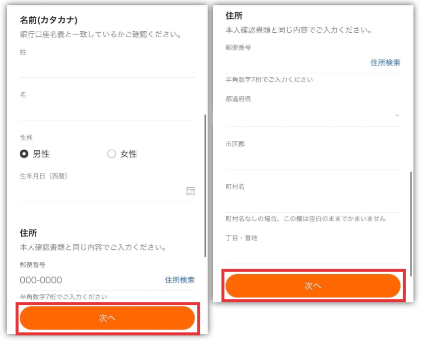 あとで提出する本人確認書類と内容が一致するように気をつけて入力しましょう。