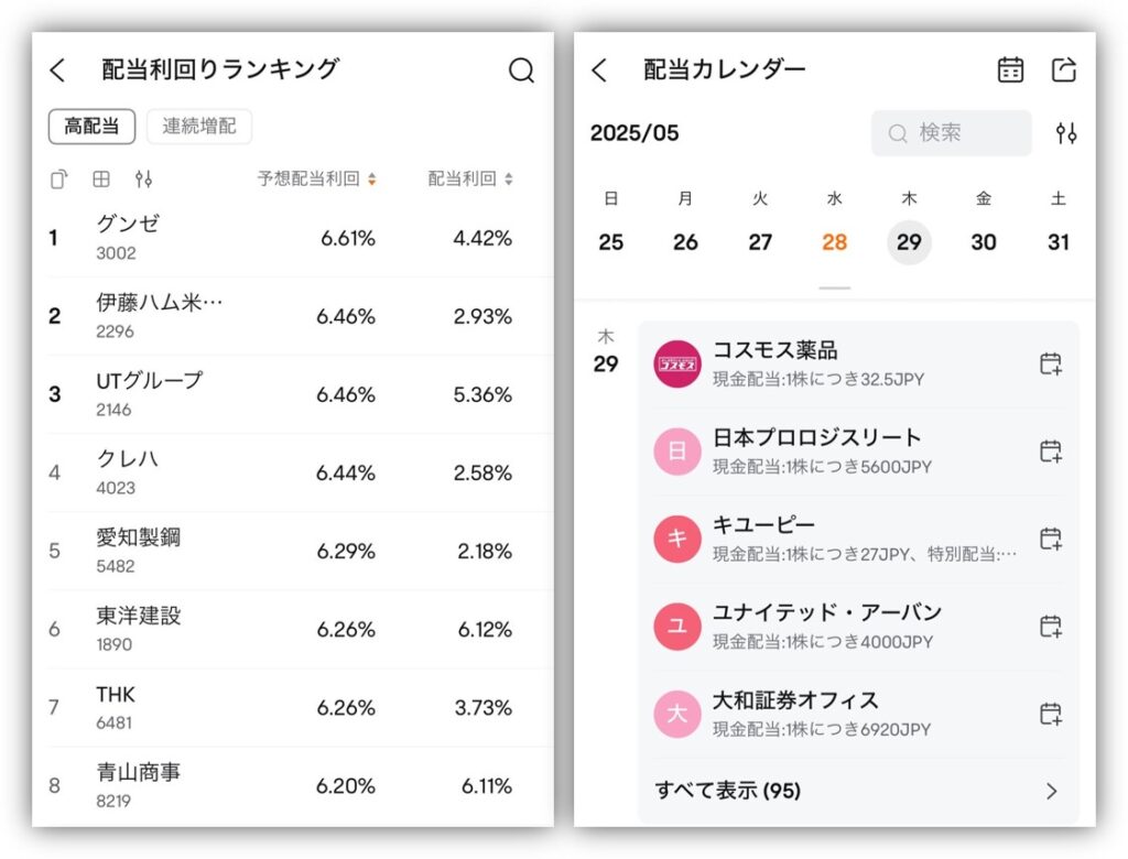 配当利回りランキングや配当カレンダーもチェックできたりするよ!