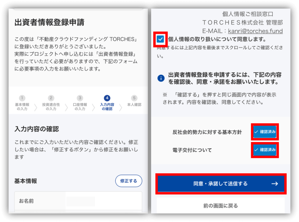問題がなければ、最後に2つの書類を確認し「同意・承諾して送信する」をタップします。