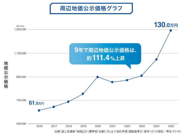 実際に周辺の地価は、9年間で約111%も上昇しています!