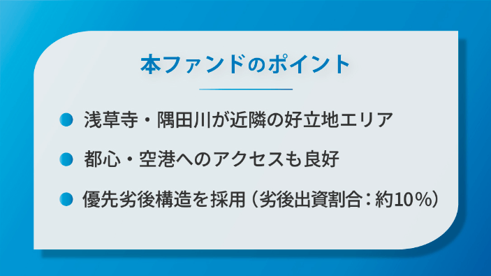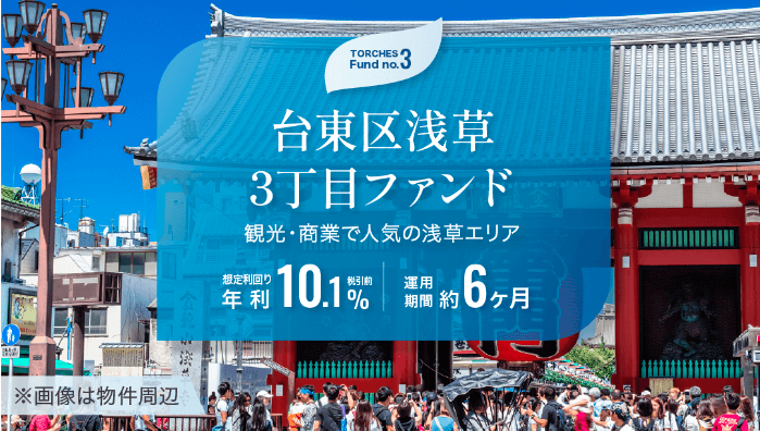 このファンドでは、観光・商業が盛んなエリアの特性を活かして、需要の高い浅草エリアで住宅・商業用不動産として売却をする予定です🥰