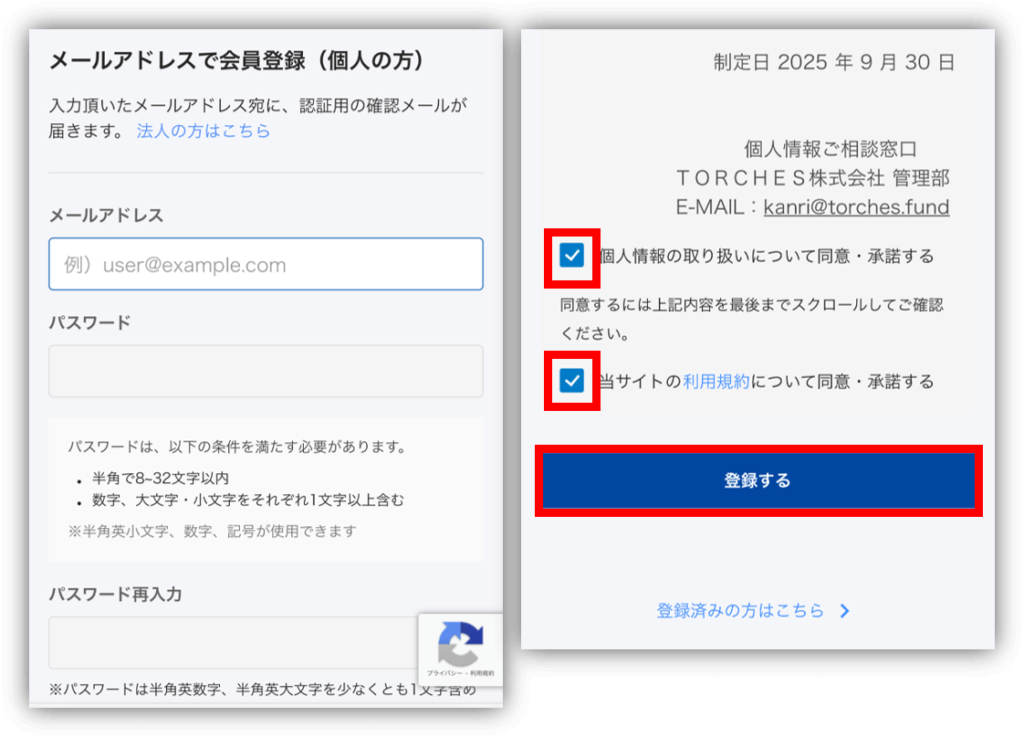 メールアドレスとパスワードを入力して、利用規約等のチェックを入れたら「登録する」をタップ!