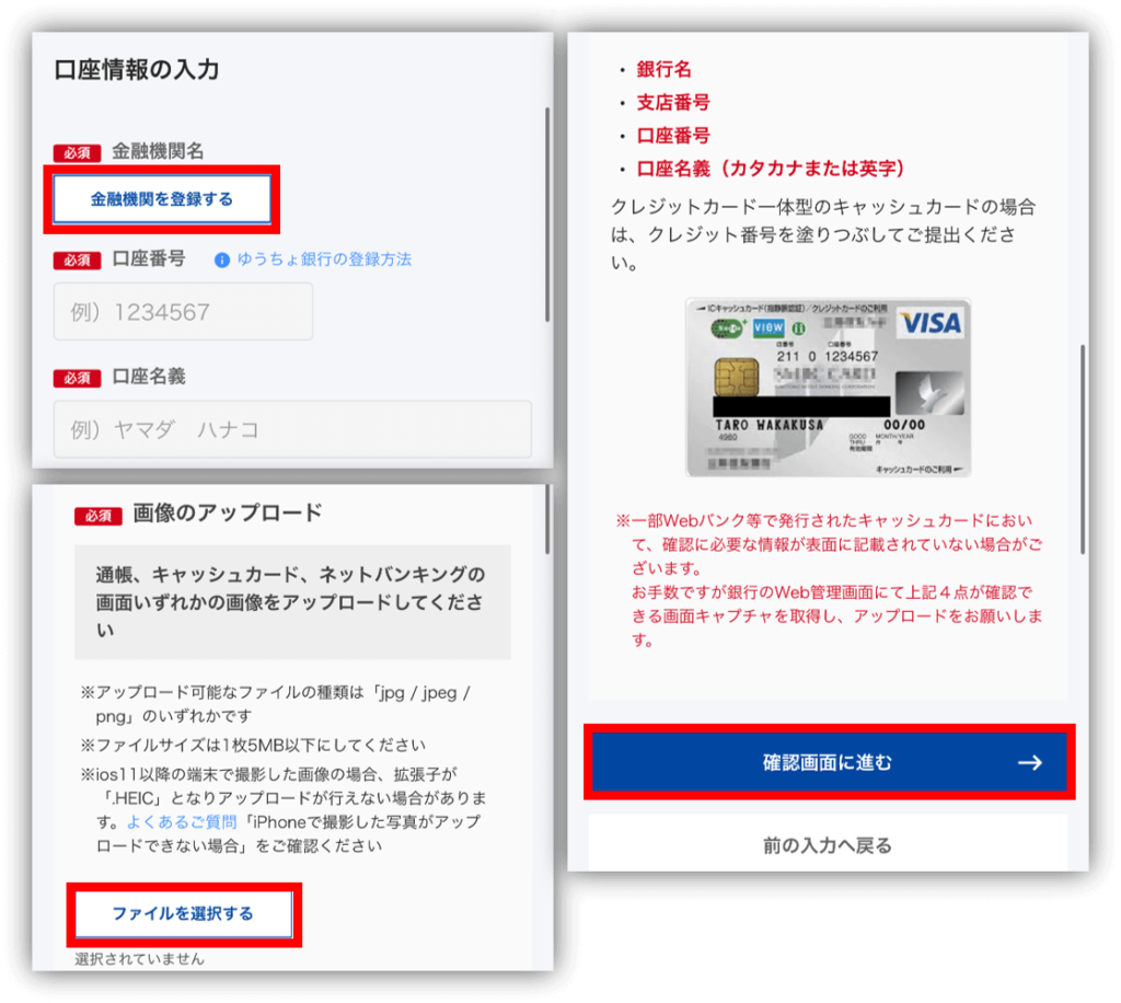 普段よく使う銀行情報を入れていき、証明画像をアップロードしたら「確認画面に進む」をタップしてください👍