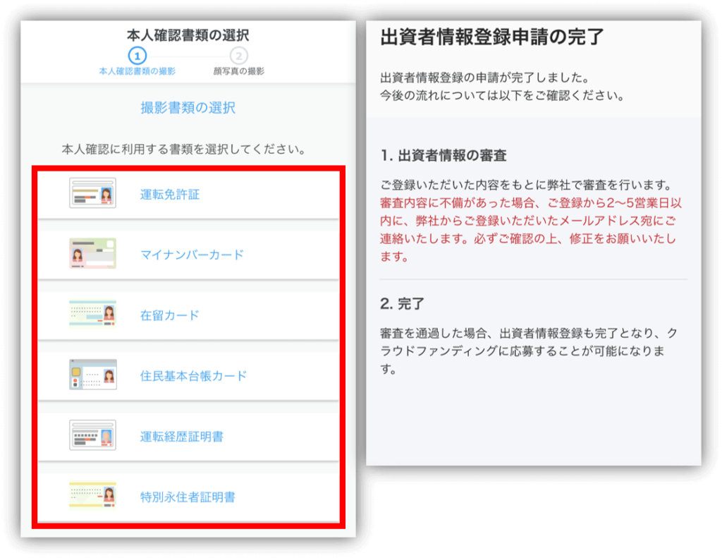すべての撮影が終わると、「出資者情報登録申請の完了」が表示されるので、審査が終わるまで少し待ちましょう🥰