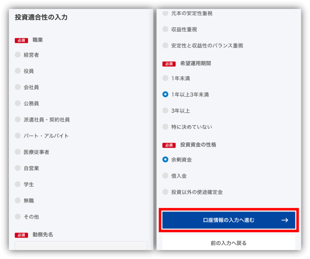 お名前から順に入力していき、入力が終わったら「投資適合性の入力へ進む」をタップ😉