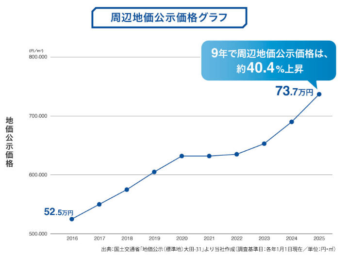 実際に周辺の地価は9年間で約40%も上昇しているほど、ブランド力があります!