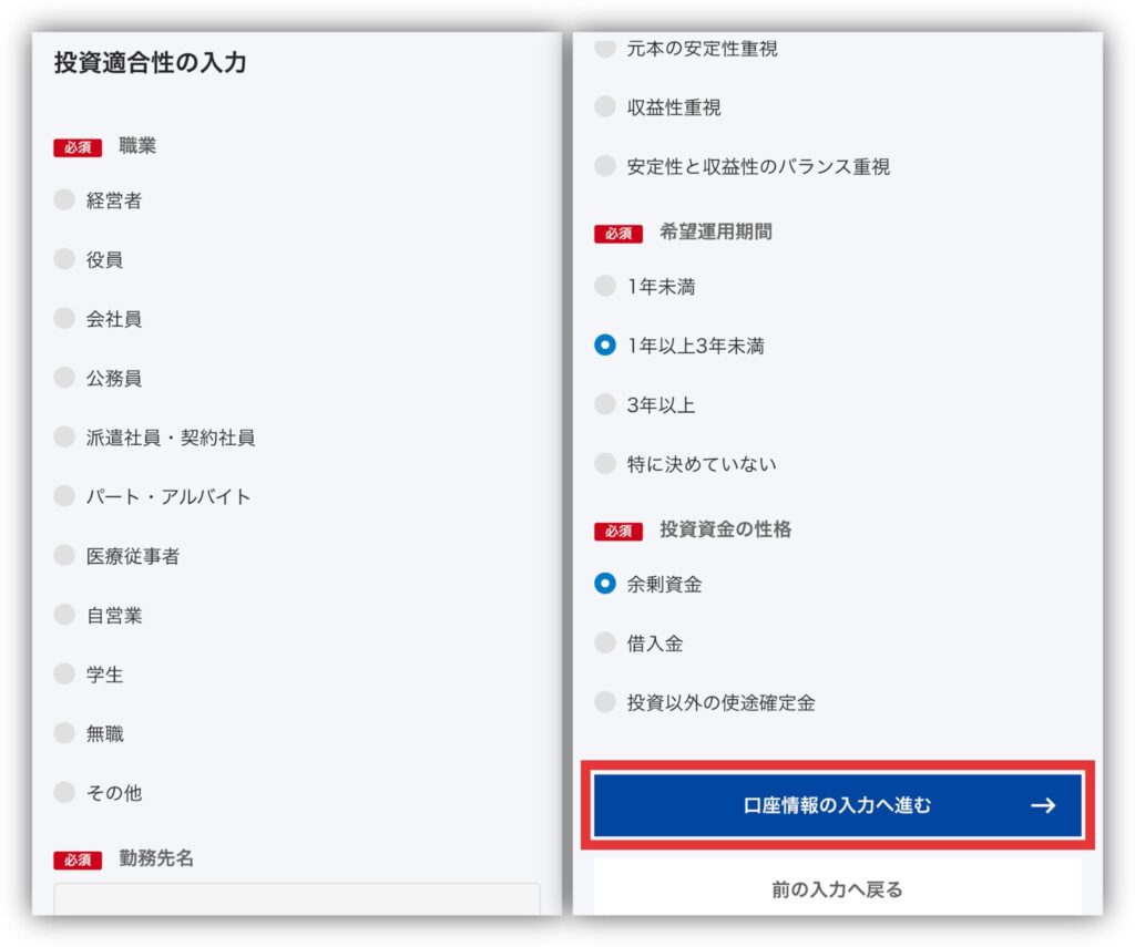 お名前から順に入力していき、入力が終わったら「投資適合性の入力へ進む」をタップ😉