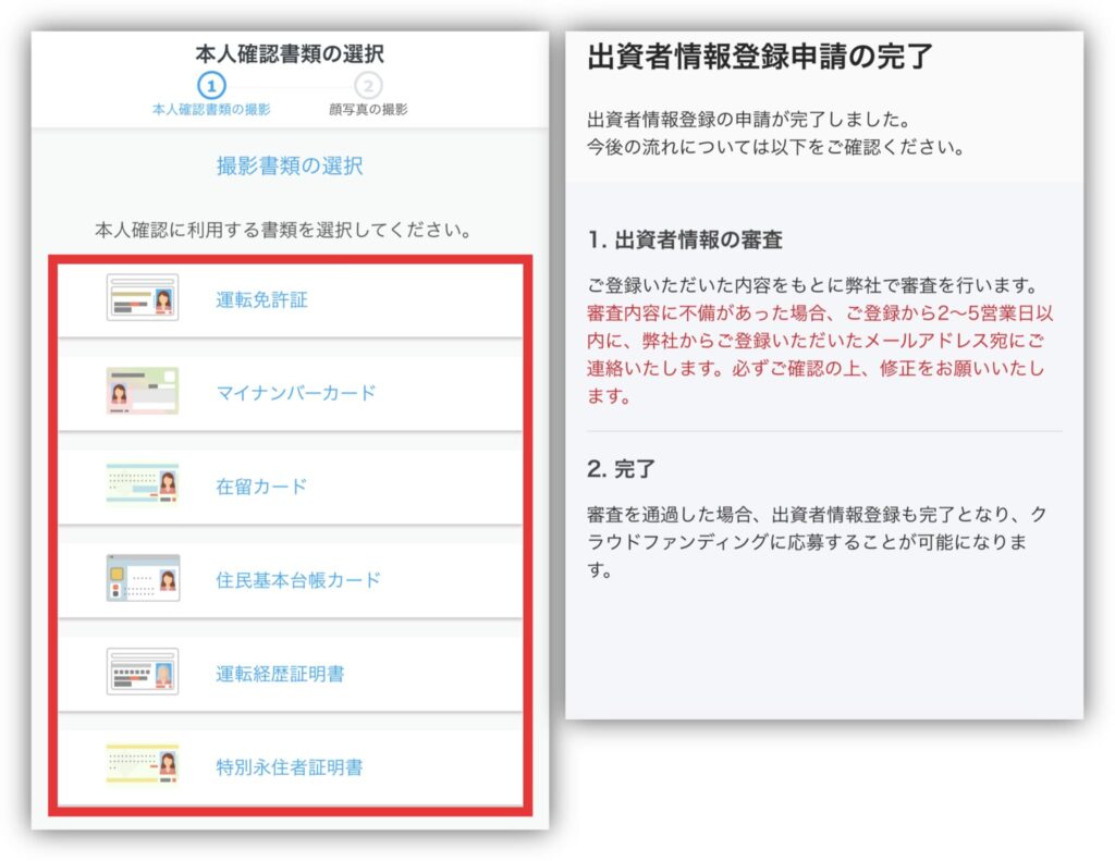 すべての撮影が終わると、「出資者情報登録申請の完了」が表示されるので、審査が終わるまで少し待ちましょう🥰