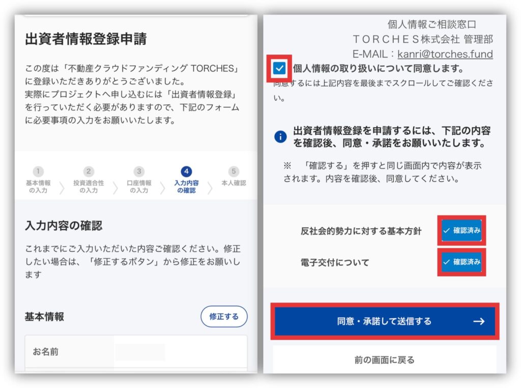 問題がなければ、最後に2つの書類を確認し「同意・承諾して送信する」をタップします。