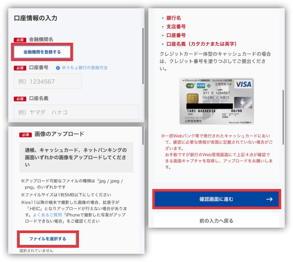 普段よく使う銀行情報を入れていき、証明画像をアップロードしたら「確認画面に進む」をタップしてください👍