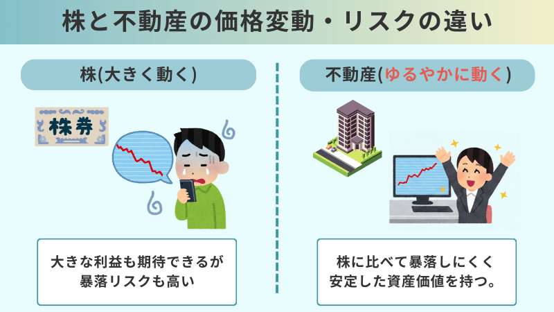 一方で、不動産は株に比べて価格の動きがゆるやかで、暴落しにくい特徴があります✨
