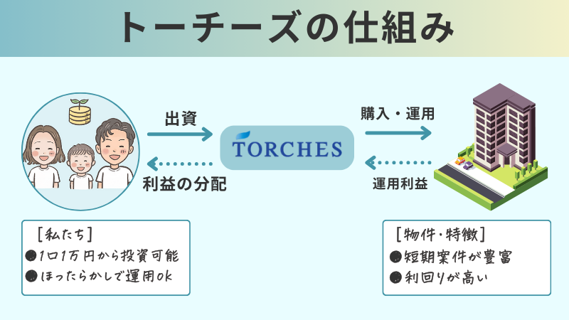 複数の投資家から資金を集めて、そのお金で事業者(トーチーズ)が不動産を購入・運用する仕組み!