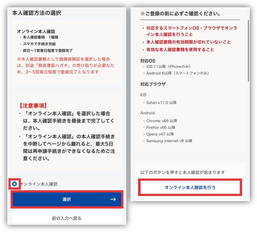 本人確認方法は「オンライン本人確認」を選んだら、「選択」をタップします。