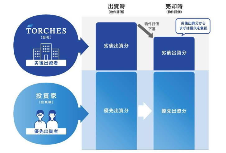 投資家が「優先出資者」、運営会社であるトーチーズが「劣後出資者」として共同で投資する仕組み。
